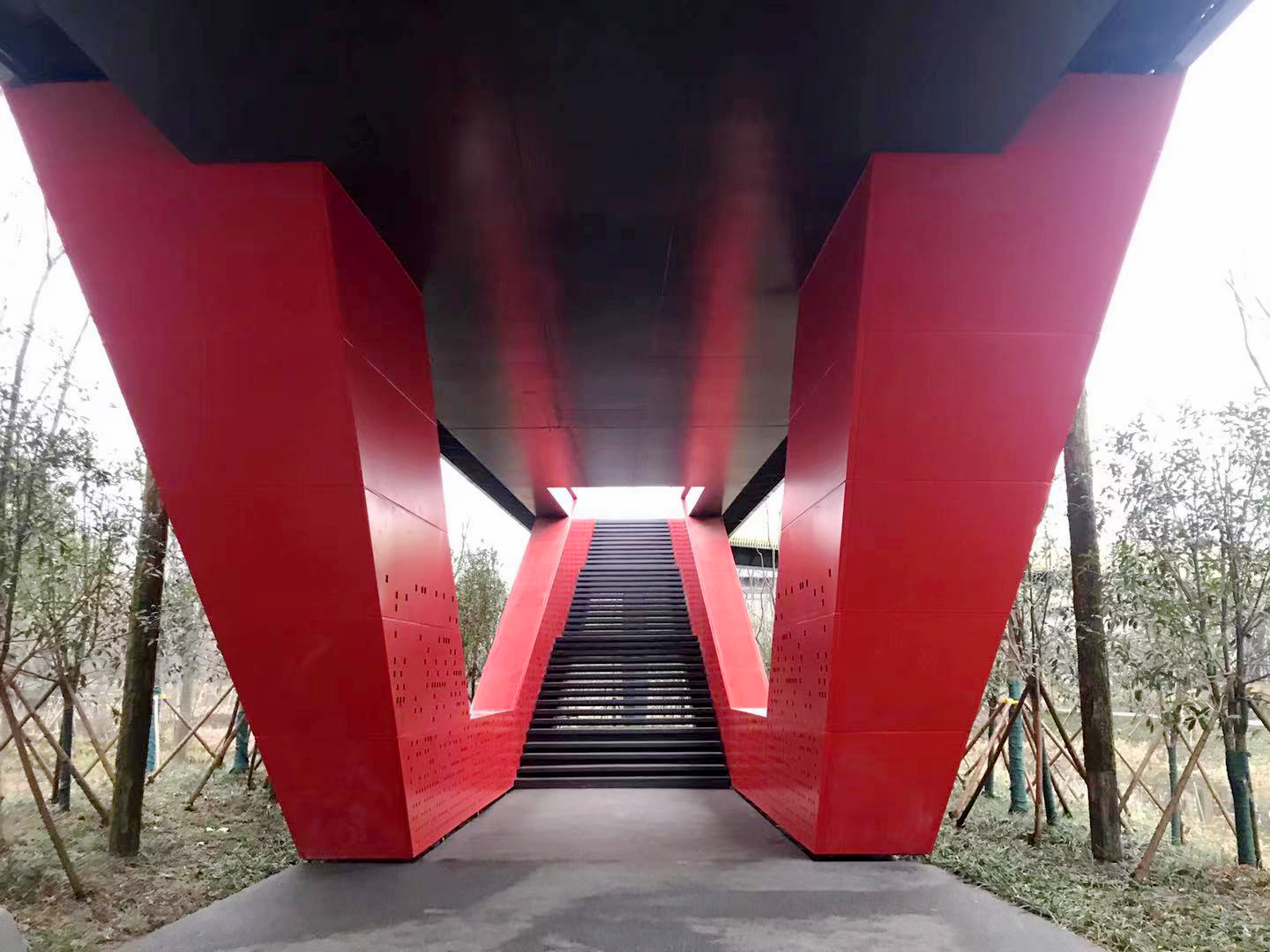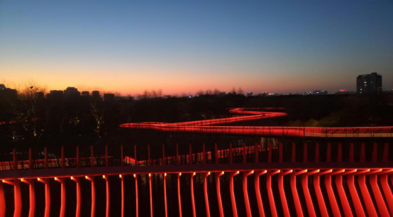 空中廊桥,是西南湖景观提升中的最大亮点,全长2462米,距离地面最高处12米,以红色为主色调,造型灵动,成为南湖中最亮眼的红。夜色下,远远望去,廊桥宛如一条即将腾飞的红色巨龙。