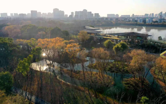 园林绿化施工,也成为此次南湖景观提升的重头戏。南湖原有苗木繁多,分布杂乱。为了提升景观的层次感,项目团队在施工的同时竭尽全力保护,对每一棵原有树苗都做到了精心呵护。同时,根据规划设计,在廊桥两侧移植了4000多棵高大乔木。人们行走在廊桥上,廊桥两侧的高大树木触手可及,宛如“走在森林上,行在画廊中”。