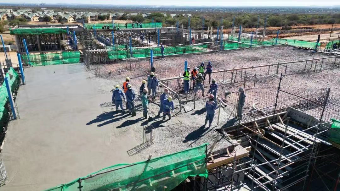 博茨瓦纳国际科技大学学生中心项目现场一片忙碌,为追赶因雨季影响而滞后的施工进度,项目全体员工加班加点同时开展主体土建工程部分与停车场及附属道路工程的施工作业,实现了施工进度的反超,赢得了业主及监理的一致认可。