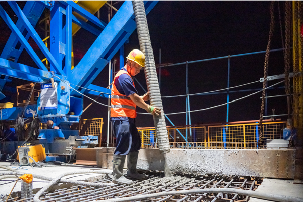 工人在进行混凝土浇筑作业