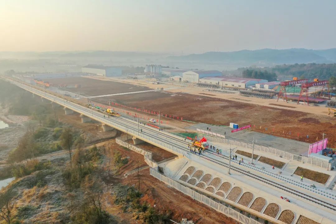 1月16日,在宣城市宣州区水东镇安莲村施工现场,省投资集团参与投资建设的宣绩高铁首对500米长钢轨平稳铺设在无砟轨道板上,标志着宣绩高铁全线开始铺轨。