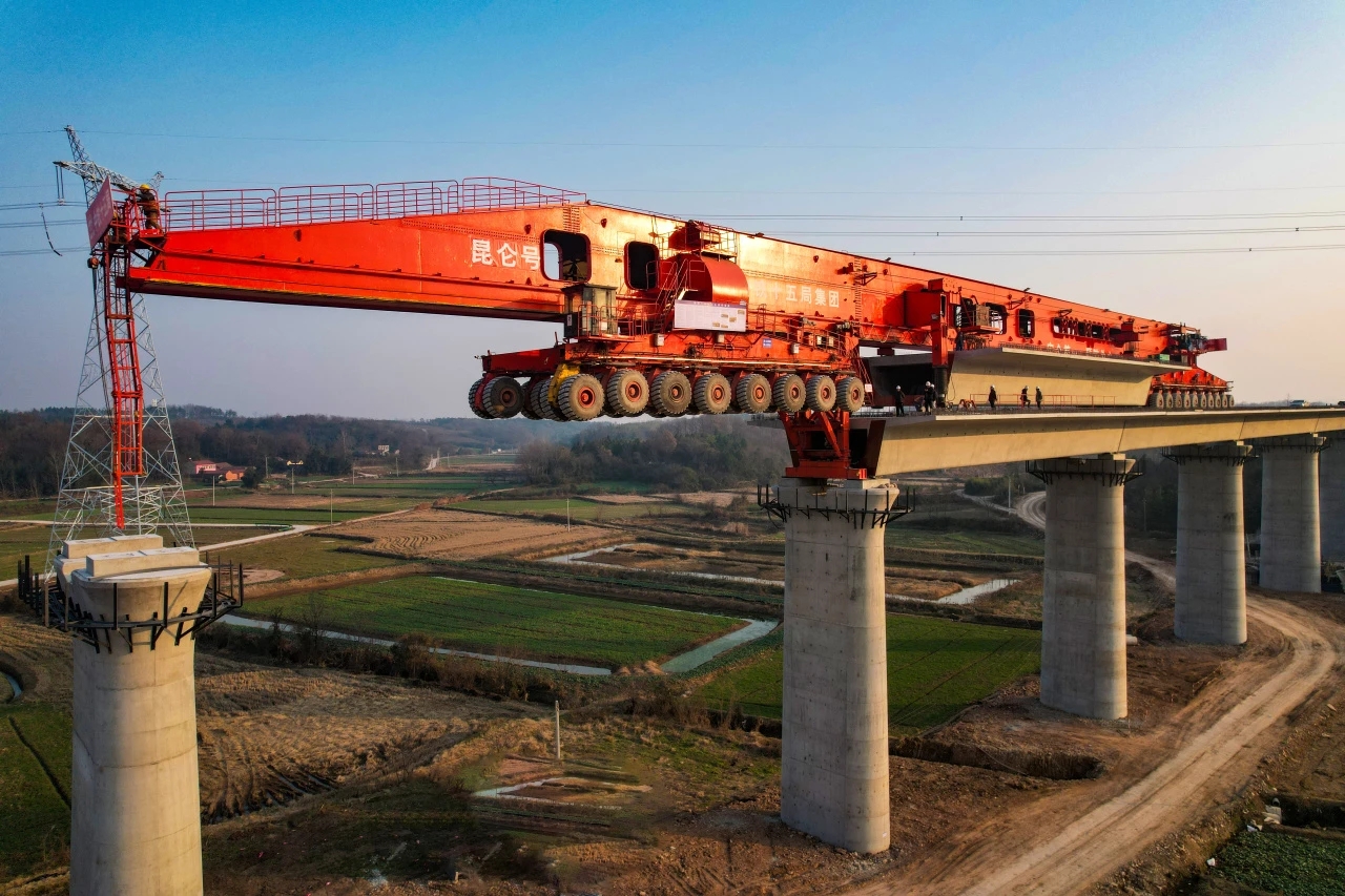 沿着1.6公里的栈桥“走”进汉江,位于宜城的襄荆高铁汉江特大桥施工现场一派繁忙,这个三跨矮塔斜拉桥的桥墩均已“出水”。高空中,工人们正在“搭积木”——墩身正在安装先进的造桥机,一次可架设8米阶段箱梁,可节约两个月工期。
