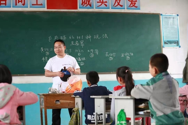 华泰证券苏州分公司志愿者王应军向孩子们讲授“乒乓球的1+1种玩法”