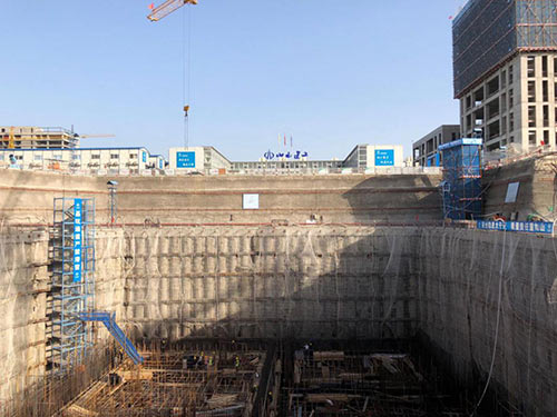 项目部克服了地下水位高、基坑深度大、支护难度大的难题,首次将桩锚支护体系运用到超深基坑的施工中,大大节约了工期和造价。在地下结构施工期间又经历了地下空间狭小、降排水控制难、物资吊运难、钢筋密集、结构构件截面大、悬挑结构多等困难。夏季天气炎热,连续十几天的40℃高温天气,项目管理人员陪同施工人员一起,尽可能的增加夜间工作时间,为完成施工内容加班加点。雨期降水连绵,基坑内作业难度大,对支护结构的影响更大,为预防雨水带来的各项安全隐患,项目设置了上部挡水、侧壁防护、坑内疏排的综合管理措施,保证了施工的安全。针对超大截面墙体的施工,项目人员群策群力,编制了专项施工方案,最终成型效果好、无渗漏。