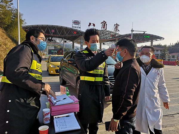 资兴高速工作人员为过往司乘人员测量体温。邓名琴 摄