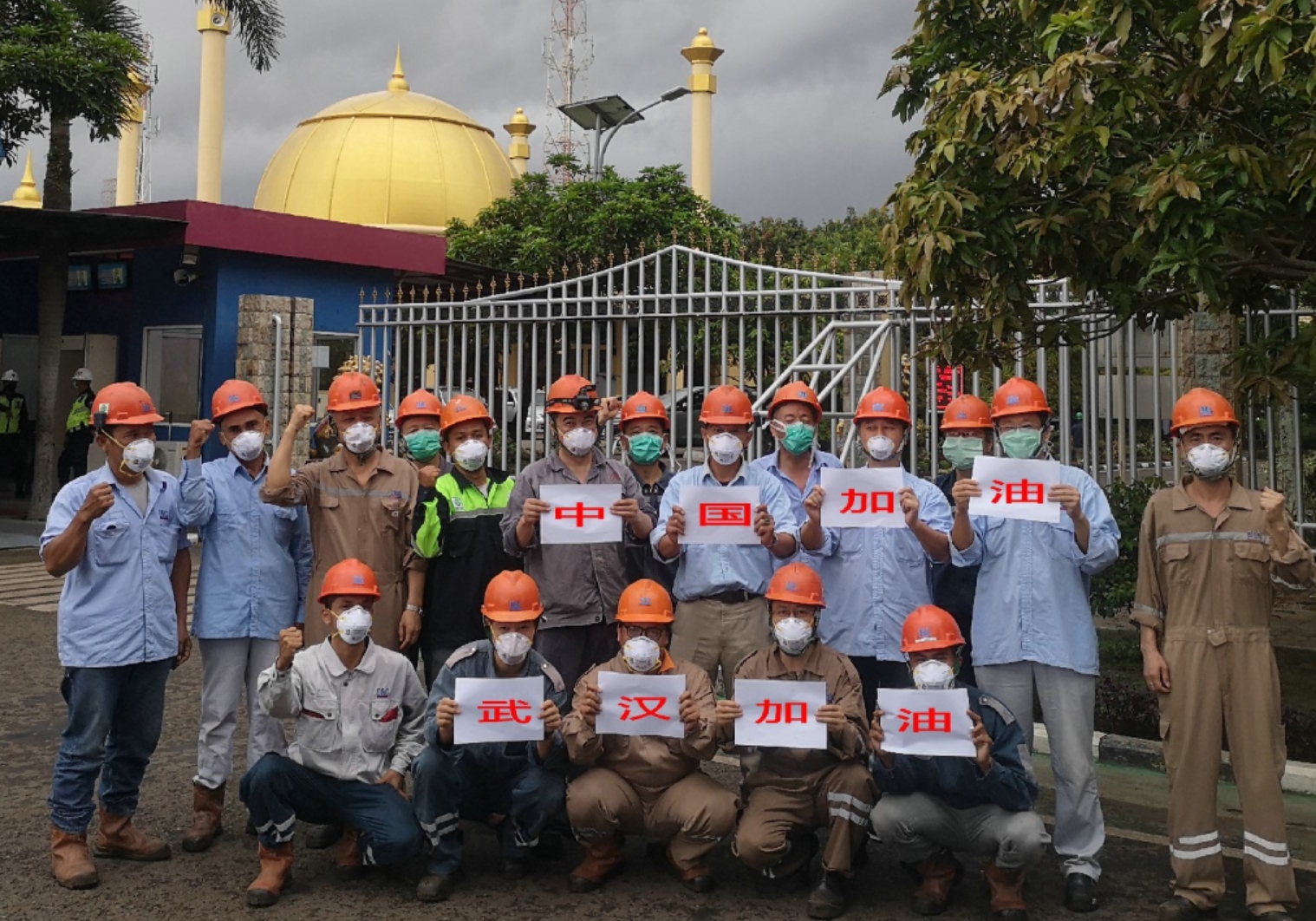 在中国大唐安徽发电公司承担运维工作的印尼芝拉扎电站,中印双方人员共同为中国加油,为武汉加油