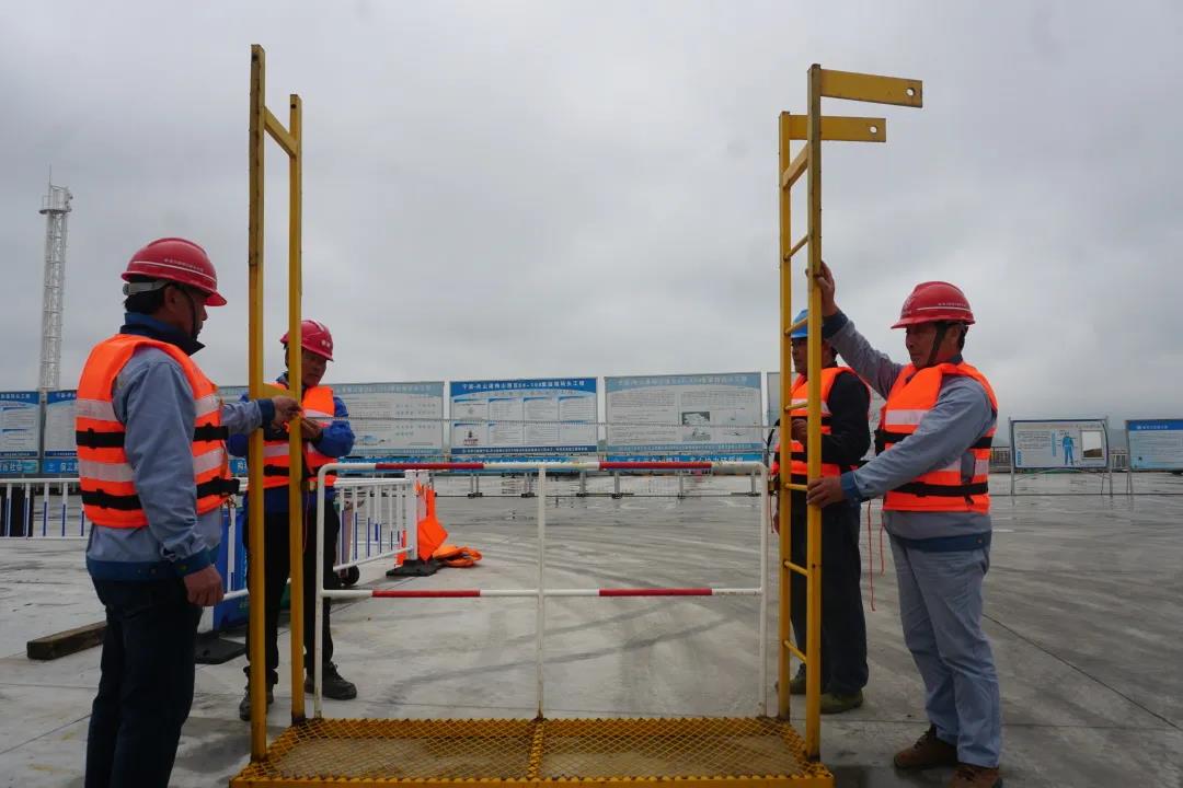 宁波舟山港梅山港区二期工程是中交集团所属中交三航局承建的全国建设品质示范工程和浙江省宁波市高桩码头品牌项目,码头平均桩高70余米,桩帽顶端外伸钢筋密集,作业空间狭小,项目部安装了防护网进行安全防护。