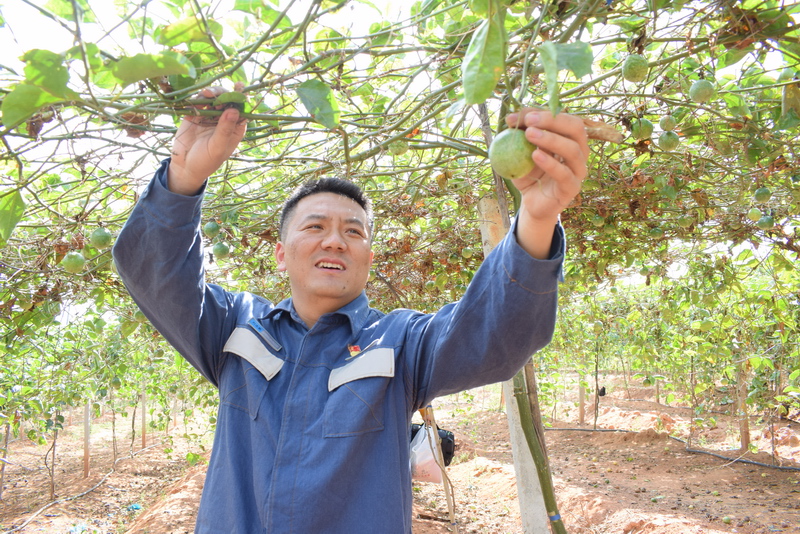 2020年1月10日,刘志鹏帮助脱贫户在百香果园里采摘黄金百香果,露出开心的笑容。林丹丹 摄