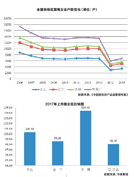 从“量”的变化来看,东北国企户数呈逐年递减态势,且在全国各地区居于末端(辽、吉、黑三省在全国排名分列第21、25和27位),但国有资本总量却稳中有增,与全国整体变化一致。