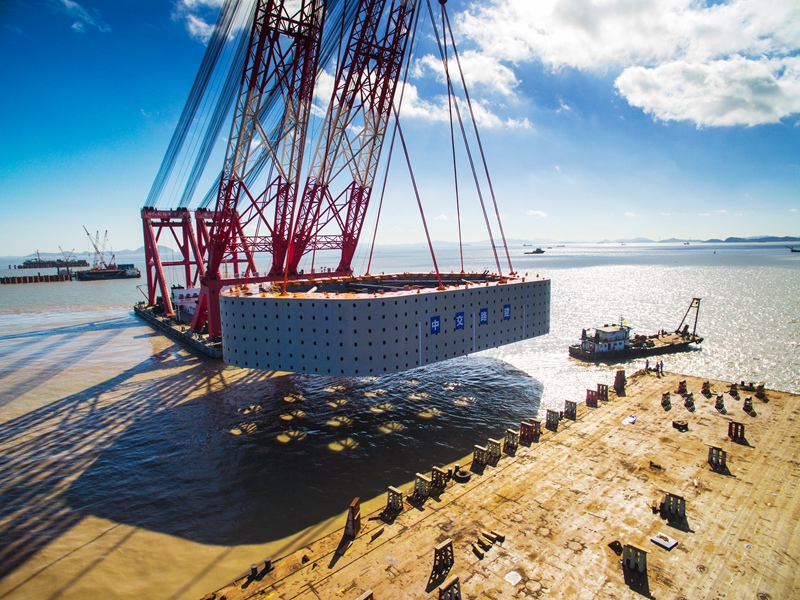舟岱跨海大桥首个10万吨级防撞钢套箱整体安装完成