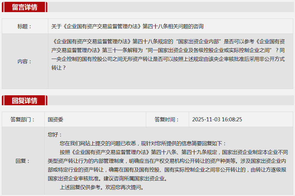 1.关于《企业国有资产交易监督管理办法》第四十八条相关问题的咨询