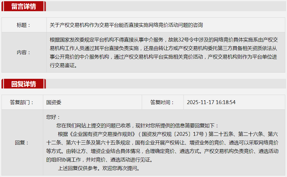 4.关于产权交易机构作为交易平台能否直接实施网络竞价活动问题的咨询