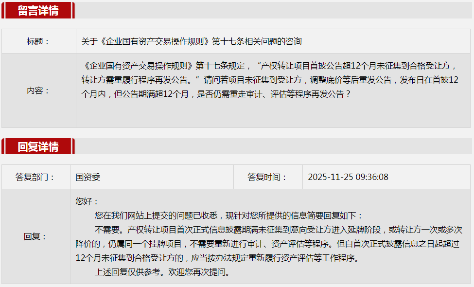 3.关于国有产权转让预披露公告到期一年后能否直接发正式披露问题的咨询