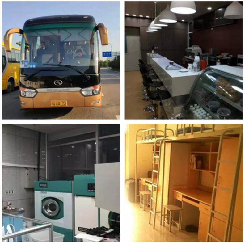 图片依次为班车、咖啡厅、洗衣房、宿舍