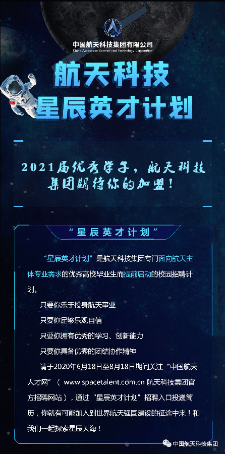 作为我国航天科技工业的主导力量,中国航天科技集团有限公司重磅发布航天科技星辰英才计划,