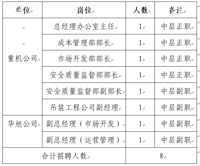 为了增强公司综合竞争能力,充实人才队伍,重机公司总部、吊装工程公司及华旭公司特面向社会公开招聘。现就有关事项公告如下: