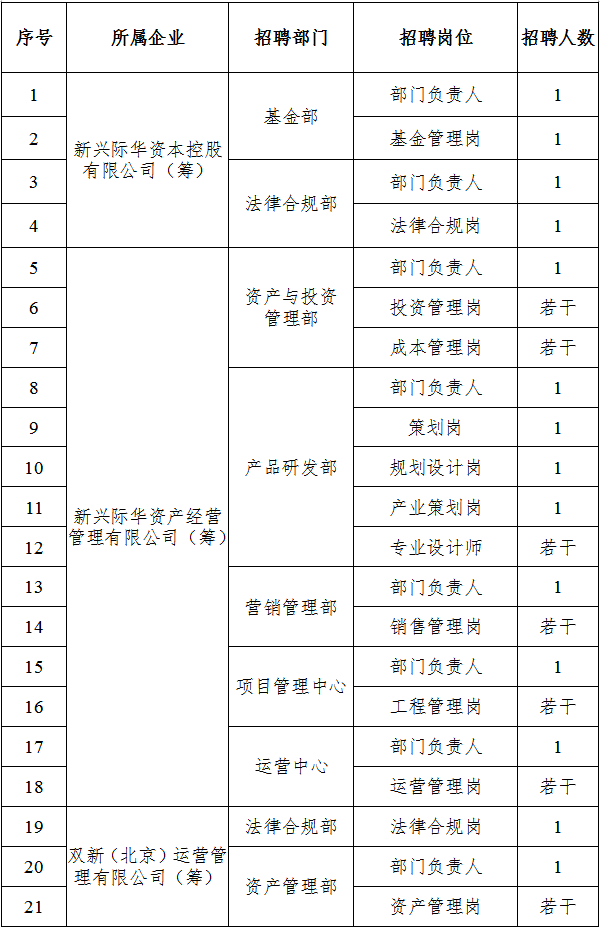 根据业务发展需要,集团公司成立新兴际华资本控股有限公司(筹)、新兴际华资产经营管理有限公司(筹)、双新(北京)运营管理有限公司(筹),现面向集团公司系统内部和社会公开招聘相关岗位人员,现将有关事项公告如下: