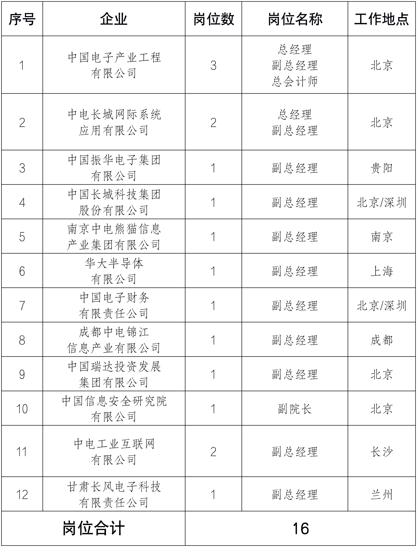 根据中国电子改革发展需要,为进一步加强干部队伍建设,现面向集团系统内外市场化选聘16位所出资企业负责人。具体事项如下: