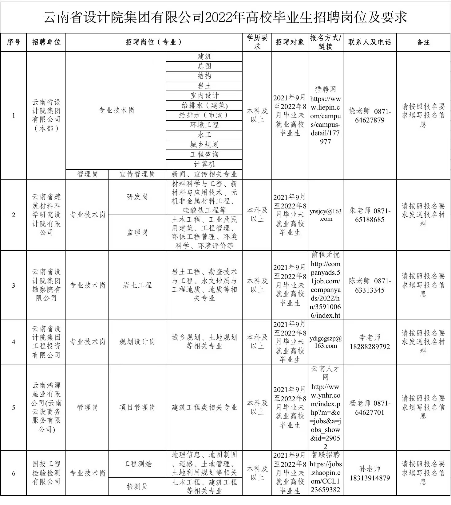 附件:云南省设计院集团有限公司2022年高校毕业生招聘岗位及要求