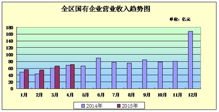 1-4月份,新疆国有及国有控股企业生产经营运行平稳,营业收入、上交税费增长,利润总额有所下降。截止4月,全区累计实现营业收入247.77亿元,同比增加23.79亿元,增长10.6%;累计实现利润总额8.07亿元,同比少增2.96亿元,下降26.8%;上交税费19.38亿元,同比增长4.44亿元,增长29.70%。截止4月底,全区国有及国有控股企业资产总额7,233.19亿元,同比增加1,055.22亿元,增长17.1%;净资产2,532.33亿元,同比增加233.54亿元,增长10.20%;资产负债率65.00%,同比增加2.21个百分点。