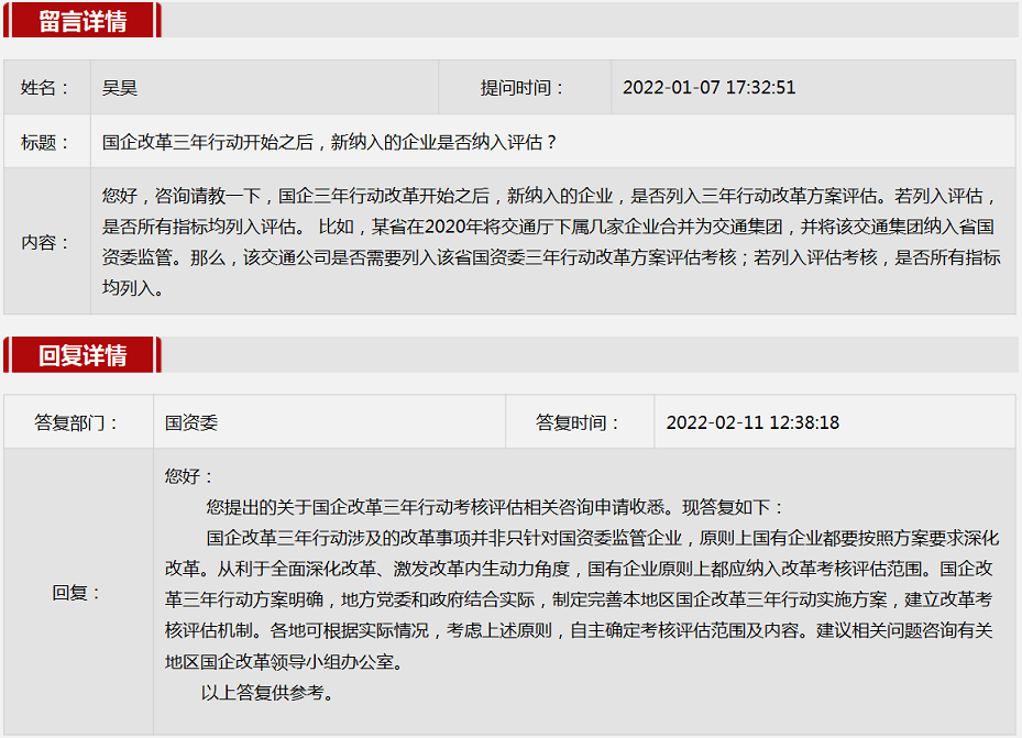 2022年2月国资委网站政务咨询栏目部分网友提出的咨询,我们初步做出了认真的回应,现选择五条关注度高、点击量高的问题,再次推荐分享。