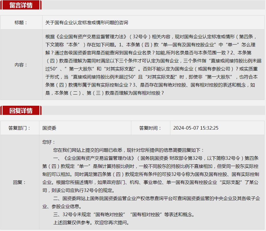 2024年5月国资委网站政务咨询栏目部分网友提出的咨询,我们初步做出了认真的回应,现选择五条关注度高、点击量高的问题,再次推荐分享。