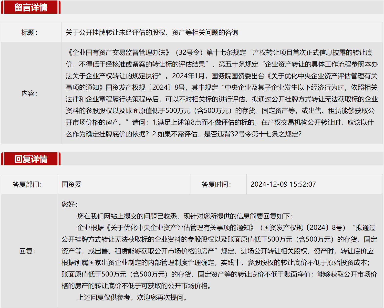2024年12月国务院国资委网站政务咨询栏目部分网友提出的咨询,我们初步做出了认真的回应,现选择五条关注度高、点击量高的问题,再次推荐分享。