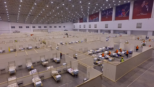 中铁十一局、中铁十四局抢建武汉客厅“方舱医院”。黄品青 摄