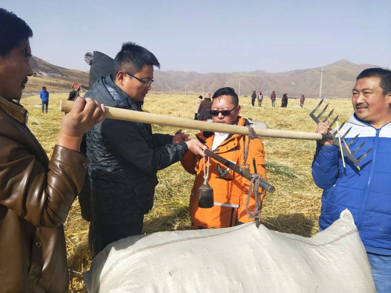 中国普天在吉迈镇龙才村援建了近千亩饲草示范基地,成为该村集体经济的支柱,将黑土荒滩改造为绿草场。图为,扶贫干部杨柯磊组织发动牧民“以工代赈”收割饲草。