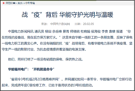 总书记强调:“统筹做好疫情防控和经济社会发展,既是一次大战,也是一次大考。”在这场大战和大考中,中国华能既是安全保电的先行者,又是抗击疫情的排头兵,充分体现了华能人的责任和担当。