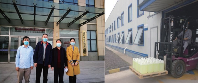 疫情发生后,面对疫情防控物资短缺局面,北矿化学(沧州)有限公司积极响应习近平总书记“疫情防控不只是医药卫生问题,而是全方位的工作,各项工作都要为打赢疫情防控阻击战提供支持”的讲话精神,全面落实党中央和国务院决策部署,根据集团党委工作要求,抓住“物资保障是打赢疫情防控阻击战的基础”的战略点,在疫情防控不放松的同时,发挥化工生产企业的技术特长和产能优势,迅速组建技改团队,在2020年1月28日农历大年初四,公司总经理尚衍波带领攻关团队下沉一线、靠前指挥、24小时驻厂攻关,在现场开展工艺及设备改造攻关,转产疫情防控急需的消毒液。