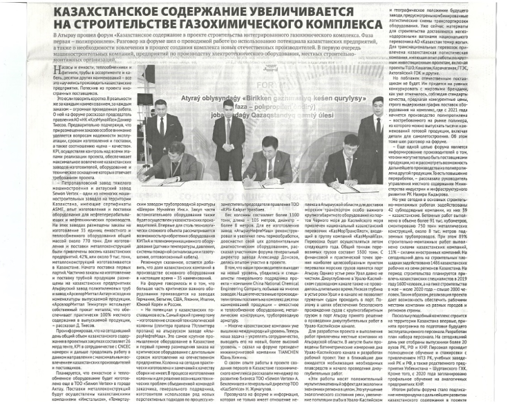 2019年10月18日哈萨克斯坦商报对IPCI项目建设过程中与本土企业的合作进行报道