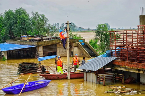江西上饶鄱阳县问桂道圩堤决口,国网江西鄱阳县供电公司紧急为重要站点安装照明设备。