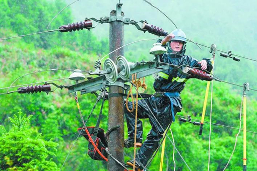 国网江西婺源县供电公司员工冒雨抢修受损线路。