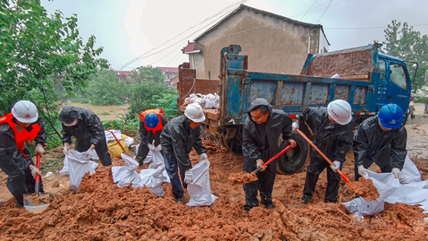 在湖北黄冈,黄梅县袁山河洪水暴涨,沿途农田、村庄被淹,中铁十一局集团安九铁路项目组织150人第一时间赶到现场,与当地驻军一道装沙袋、打木桩,进行河堤加固。蕲河水位受暴雨持续上涨,双沟蕲河大桥钢栈桥水位距警戒水位不足1米,中铁十八局集团黄冈项目部经过7个小时的奋战,装运8000多个防汛沙袋,圆满完成堤坝加固任务,有效遏制了险情。