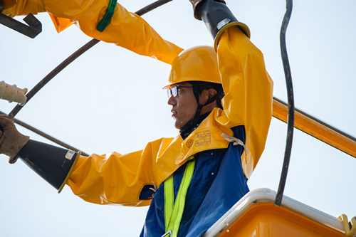 国网重庆长寿供电公司带电作业班员工对故障引流线进行恢复操作。