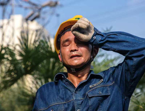 国网安徽宿州供电公司员工处理树障近两小时,汗水模糊了眼睛。