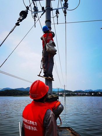 国网江西彭泽县供电公司党员服务队乘船检修被淹的10千伏农场线。