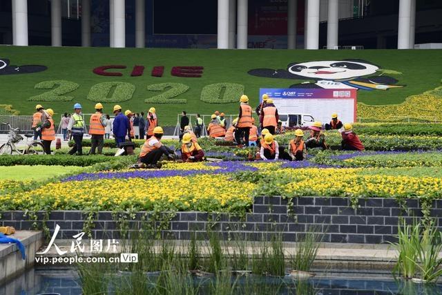 2020年10月17日,第三届中国国际进口博览会举办地上海国家会展中心现场,工作人员为南广场摆放主题迎宾花卉图案。第三届进博会主题迎宾花卉图案设计以自上而下的“云山—梯田花海—河流—现代城市花园”四个空间脉络,360度显示中国锦绣缤纷的自然之美。