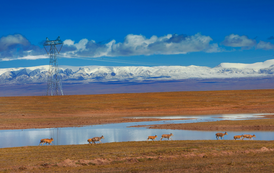 作品说明:照片拍摄于可可西里,里面有雪山、草地、藏羚羊、还有特高压,照片中的电网为青藏联网工程,结束了西藏电网孤网运行的历史,体现出国家电网的社会责任。